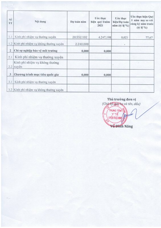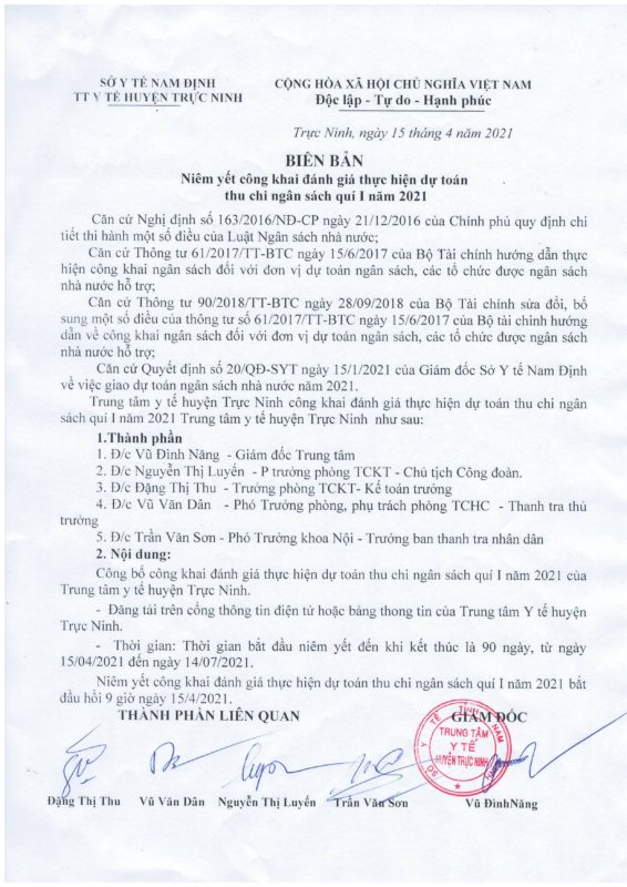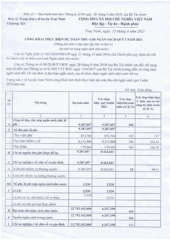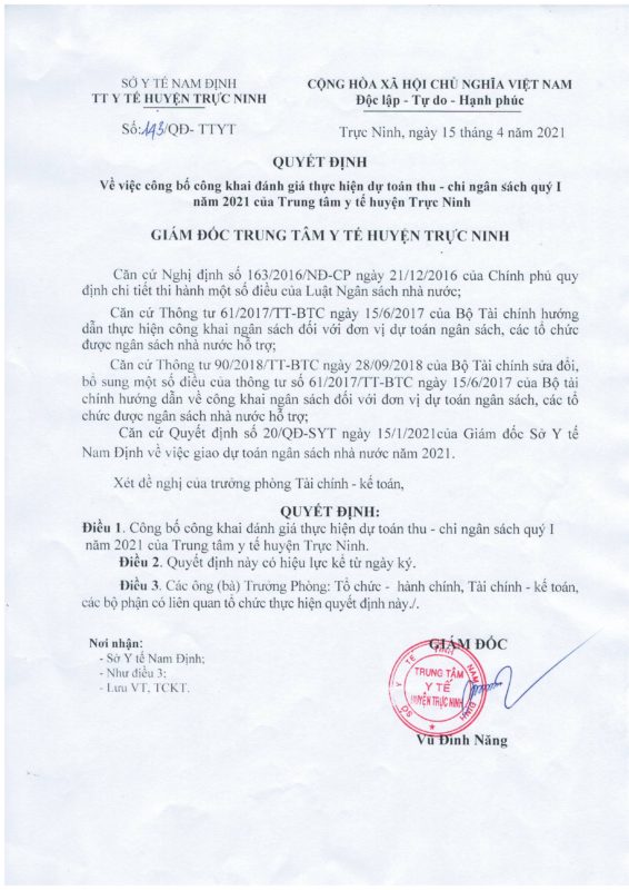 Quyết định về việc công bố công khai đánh giá thực hiện dự toán thu – chi ngân sách quý I năm 2021 của Trung tâm Y tế huyện Trực Ninh
