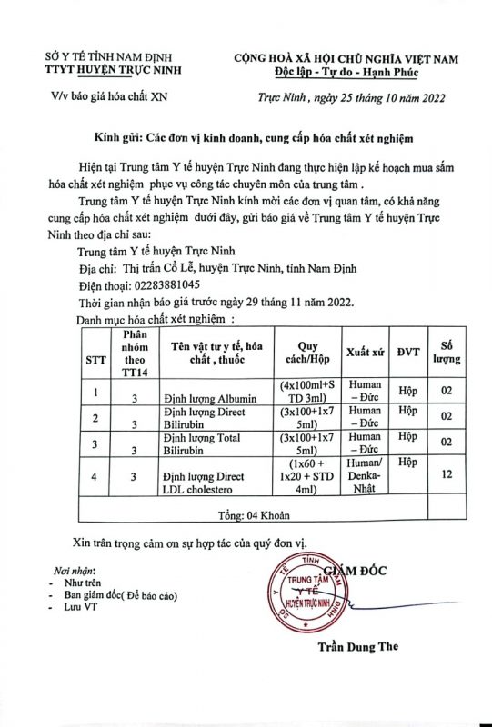 Tin tức sự kiện Về việc báo giá hóa chất xét nghiệm Ngày đăng 27 Tháng 10, 2022 Bởi admin admin Kết thúc niêm yết công khai dự toán quý II và 6 tháng đầu năm 2022 Thư mời báo giá gói thầu mua sắm: bàn ,ghế, tủ đựng tài liệu.